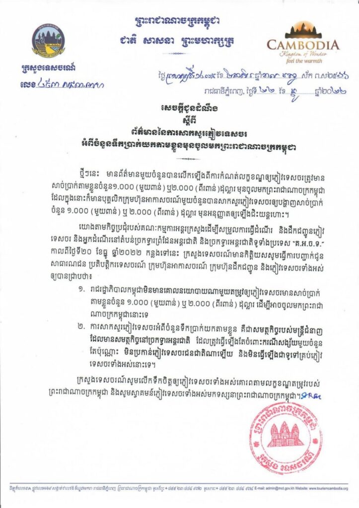 យោងតាមសេចក្ដីជូនដំណឹងរបស់ក្រសួងទេសចរណ៍ «រាជរដ្ឋាភិបាលកម្ពុជា មិនមានគោលនយោបាយណាមួយតម្រូវឱ្យភ្ញៀវទេសចរមានសាច់ប្រាក់តាមខ្លួនចំនួន១,០០០ដុល្លារ ឬ២,០០០ដុល្លារ ដើម្បីអាចចូលប្រទេសកម្ពុជានោះទេ»។