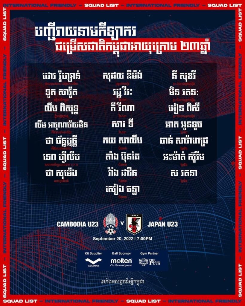 (ភ្នំពេញ)៖ សហព័ន្ធកីឡាបាល់ទាត់កម្ពុជា (FFC) បានបង្ហាញបញ្ជីឈ្មោះកីឡាករ នៃក្រុមជម្រើសជាតិកម្ពុជា និងក្រុមជម្រើសជាតិយុវជនអាយុក្រោម ២៣ឆ្នាំកម្ពុជាជាផ្លូវការហើយ ដែលមានសមាជិកចំនួន ២២នាក់ដូចគ្នា ដើម្បីត្រៀមការប្រកួតមិត្តភាពអន្ដរជាតិជាមួយក្រុមជម្រើសជាតិបង់ក្លាដែស និងក្រុមជម្រើសជាតិ U23 ជប៉ុន នាថ្ងៃទី២០ និងថ្ងៃទី២២ ខែកញ្ញា ឆ្នាំ២០២២ ខាងមុខ។