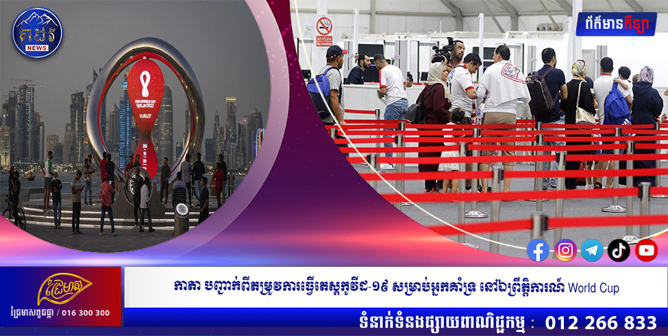 (ដូហា)៖ អ្នកគាំទ្រដែលនឹងចូលរួមក្នុងព្រឹត្តិការណ៍ World Cup នៅប្រទេសកាតា ត្រូវតែបង្ហាញពីលទ្ធផលនៃការធ្វើតេស្តអវិជ្ជមាន ជំងឺកូវីដ-១៩ ដោយមិនគិតពីស្ថានភាព នៃការចាក់វ៉ាក់សាំងរបស់ពួកគេនោះទេ, នេះបើតាមការបញ្ជាក់ពីអ្នករៀបចំកម្មវិធី នៅក្នុងសេចក្តីថ្លែងការណ៍ ហើយត្រូវបានចុះផ្សាយដោយសារព័ត៌មាន CNA នាយប់ថ្ងៃទី២៩ ខែកញ្ញា ឆ្នាំ២០២២នេះ។
