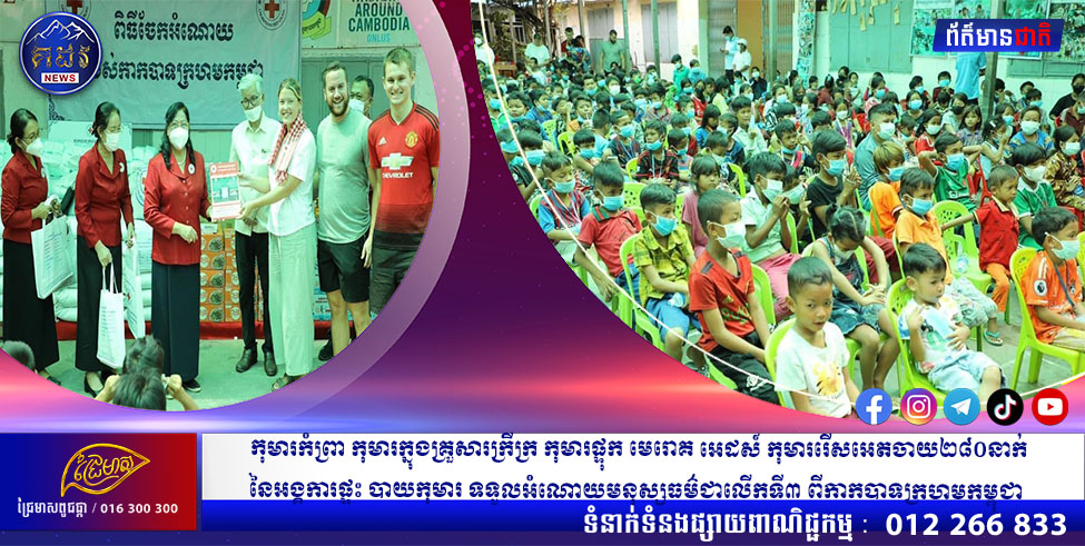 ភ្នំពេញ ៖ កាកបាទក្រហមកម្ពុជា ដែលមាន ហ្លួងម៉ែ នរោត្តម មុនិនាថ សីហនុ ជាព្រះប្រធានកិត្តិយស និង សម្តេចកិត្តិព្រឹទ្ធបណ្ឌិត ប៊ុន រ៉ានី ហ៊ុនសែន ជាប្រធាន បានផ្តល់អំណោយមនុស្សធម៌ជាលើកទី៣ ដែលរួម មានគ្រឿងឧបភោគបរិភោគ សម្ភារប្រើប្រាស់ និងថវិកា ចំនួន ១០លានរៀល ជូនដល់ អង្គការផ្ទះបាយកុមារ ដែលមានបន្ទុកជួយផ្គត់ផ្គង់ការហូបចុក និងការសិក្សា រៀនសូត្រដល់កុមារកំព្រា កុមារក្នុងគ្រួសារក្រីក្រ កុមារផ្ទុកមេរោគអេដស៍ កុមាររើសអេតចាយ ប្រមាណ ២៨០នាក់។ពិធីប្រគល់ប្រារព្ធនៅ ស្ថិតនៅក្នុងបរិវេណ សាលាបឋមសិក្សាជ័យជំនះ ក្នុងសង្កាត់បឹងកេងកង៣ ខណ្ឌបឹងកេងកង រាជធានីភ្នំពេញ នៅថ្ងៃទី ២៥ ខែសីហា ឆ្នាំ២០២២ ។