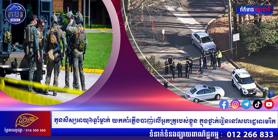 (វ៉ាស៉ីនតោន)៖ ប៉ូលិសអាមេរិកបានឱ្យដឹងថា កាលពីរសៀលថ្ងៃសុក្រ (ពេលវេលាក្នុងតំបន់) កូនសិស្សអាយុត្រឹមតែ៦ឆ្នាំម្នាក់ បានយកកាំភ្លើងបាញ់ទៅលើគ្រូរបស់ខ្លួន នៅឯសាលារៀនមួយកន្លែង ក្នុងរដ្ឋវើជីនៀ (Virginia) និងបណ្តាលឱ្យគ្រូបង្រៀនរូបនោះទទួលរងរបួសធ្ងន់ ខណៈក្មេងប្រុសដែលបង្កហេតុ ត្រូវបានអាជ្ញាធរឃាត់ខ្លួន។ នេះបើតាមការចេញផ្សាយដោយ ទីភ្នាក់ងារព័ត៌មាន AFP នៅថ្ងៃសៅរ៍ ទី៧ ខែមករា ឆ្នាំ២០២៣។
