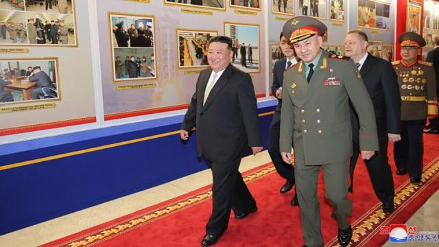 មេដឹកនាំកូរ៉េខាងជើង លោក គីម ជុងអ៊ុន បានផ្តល់ឱ្យរដ្ឋមន្ត្រីការពារជាតិរុស្ស៊ី លោក Sergei Shoigu ដែលជាស្ថាបត្យករនៃការវាយប្រហាររបស់ទីក្រុងមូស្គូមកលើប្រទេសអ៊ុយក្រែន ដើម្បីទស្សនាការតាំងពិពណ៌ការពារជាតិក្នុងទីក្រុងព្យុងយ៉ាងកាលពីថ្ងៃពុធ ជាមួយនឹងរូបភាពពីប្រព័ន្ធផ្សព្វផ្សាយកូរ៉េខាងជើងបង្ហាញពួកគេដើរកាត់សព្វាវុធពីនុយក្លេអ៊ែររបស់ទីក្រុងព្យុងយ៉ាង។ – មីស៊ីលផ្លោងដែលមានសមត្ថភាពដល់យន្តហោះគ្មានមនុស្សបើកថ្មីបំផុតរបស់ខ្លួន។