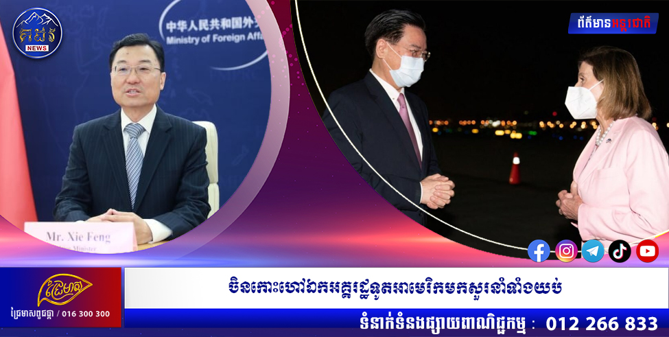 ប៉េកាំង៖ អនុរដ្ឋមន្ត្រីការបរទេសចិន លោក Xie Feng បានកោះហៅឯកអគ្គរដ្ឋទូតអាមេរិកប្រចាំនៅប្រទេសចិន លោក Nicholas Burns ជាបន្ទាន់កាលពីយប់ថ្ងៃអង្គារសប្តាហ៍នេះ ហើយបានបង្ហាញនូវការតវ៉ាយ៉ាងខ្លាំងចំពោះដំណើរទស្សនកិច្ចរបស់ប្រធានសភាតំណាងរាស្រ្តអាមេរិក លោកស្រី Nancy Pelosi ទៅកាន់កោះតៃវ៉ាន់របស់ប្រទេសចិន។