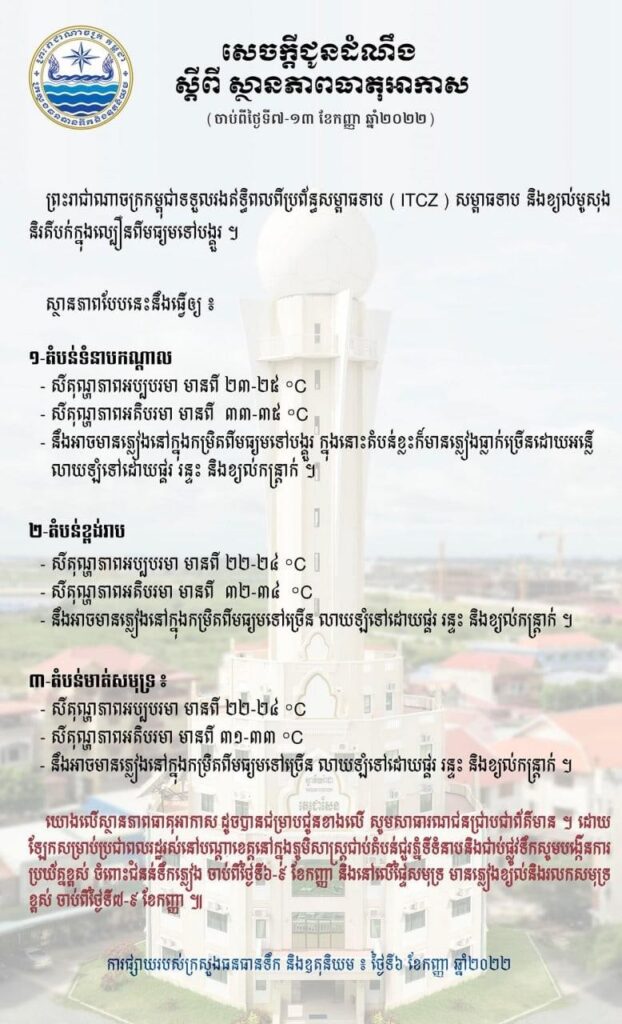 (ភ្នំពេញ)៖ ក្រសួងធនធានទឹក និងឧតុនិយម នៅព្រឹកថ្ងៃទី៦ ខែកញ្ញា ឆ្នាំ២០២២នេះ បានចេញសេចក្តីជូនដំណឹង ស្តីពីស្ថានភាពធាតុអាកាសនៅកម្ពុជា ចាប់ពីថ្ងៃទី៧-១៣ ខែកញ្ញា ឆ្នាំ២០២២។