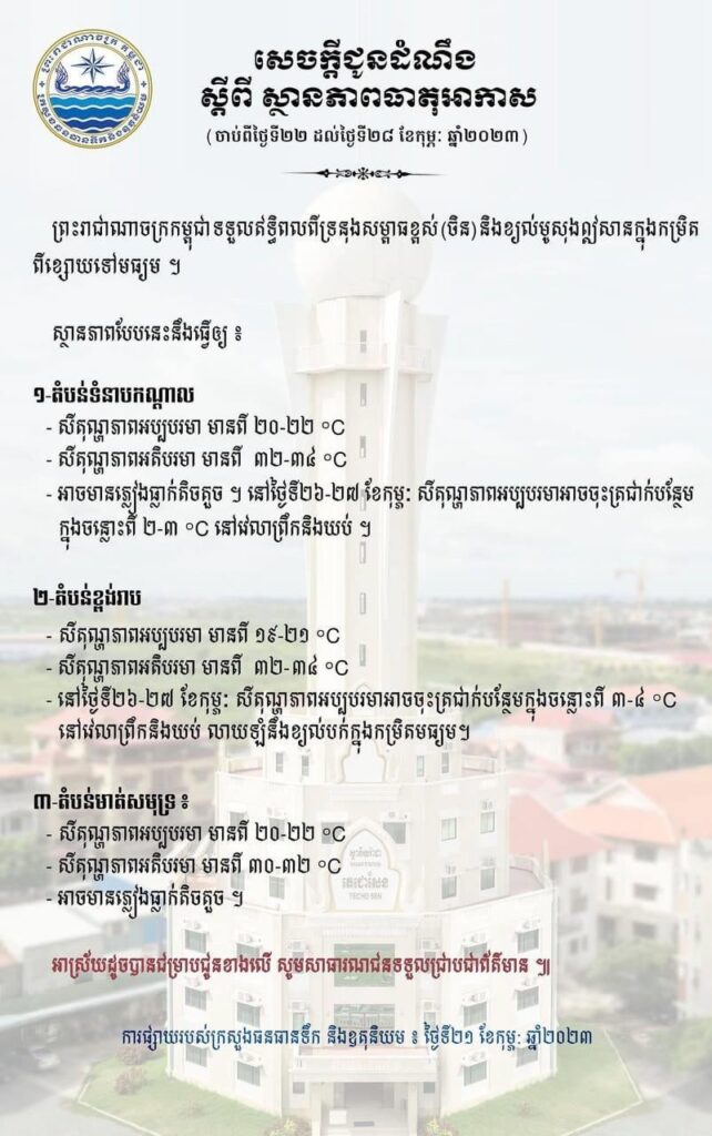 (ភ្នំពេញ)៖ ក្រសួងធនធានទឹក និងឧតុនិយម នៅថ្ងៃទី២១ ខែកុម្ភៈ ឆ្នាំ២០២៣នេះ បានចេញសេចក្តីជូនដំណឹងពីស្ថានភាពធាតុអាកាសនៅកម្ពុជា ចាប់ពីថ្ងៃទី២២ ដល់ ថ្ងៃទី២៨ ខែកុម្ភៈ ឆ្នាំ២០២៣។