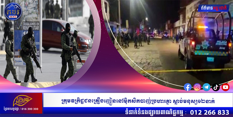 (ម៉ិកស៉ីកូស៉ីធី)៖ ក្រុមខ្មាន់កាំភ្លើងដែលមិនស្គាល់អត្តសញ្ញាណ បានបើកការវាយប្រហារនៅក្នុង បារកម្សាន្តមួយកន្លែង ស្ថិតក្នុងទីក្រុងអ៉ីរ៉ាពូតូ (Irapuato) ភាគកណ្តាលប្រទេសម៉ិកស៉ិក កាលពីយប់ថ្ងៃសៅរ៍ចុងសប្តាហ៍នេះ ហើយបានបណ្តាលឱ្យបុរស៦នាក់ និងស្រ្តី៦នាក់ បាត់បង់ជីវិត ខណៈវាគឺជាករណីបាញ់ប្រហារទ្រង់ទ្រាយធំលើកទី២ នៅរដ្ឋក្វាណាជូតូ (Guanajuato) ក្នុងរយៈពេលមិនដល់១ខែឡើយ។ នេះបើតាមការចេញផ្សាយដោយ ទីភ្នាក់ងារសារព័ត៌មាន AFP នៅថ្ងៃអាទិត្យ ទី១៦ ខែតុលា ឆ្នាំ២០២២។