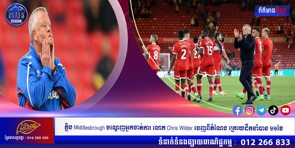 (ឡុងដ៍)៖ ក្លិបអង់គ្លេស Middlesbrough បានបណ្តេញអ្នកចាត់ការ Chris Wilder ចេញពីតំណែង ជាមួយនឹងក្លិបស្ថិតក្នុងចំណាត់ថ្នាក់ទី២២ ក្នុងតារាង Championship។ នេះបើយោងតាមសារព័ត៌មាន BBC ចេញផ្សាយនាថ្ងៃទី០៤ ខែតុលា ឆ្នាំ២០២២។