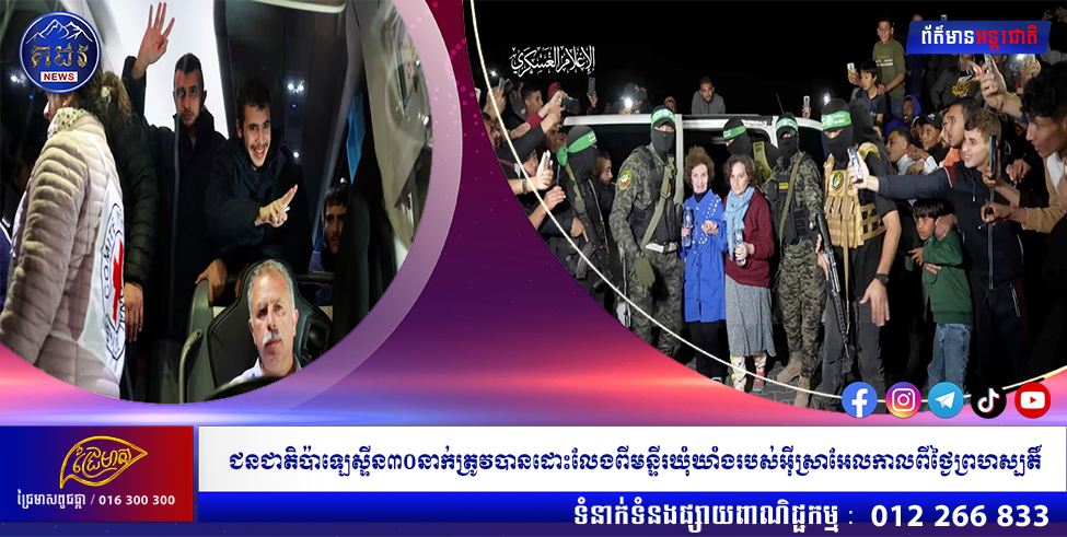 សេវាកម្មពន្ធនាគារអ៊ីស្រាអែលបាននិយាយនៅក្នុងសេចក្តីថ្លែងការណ៍មួយថា ជនជាតិប៉ាឡេស្ទីនសរុបចំនួន 30 នាក់ត្រូវបានដោះលែងពីពន្ធនាគារអ៊ីស្រាអែលនៅ Damon, Megiddo, Ofer, Nafha, Ktzi’ot និង Ramon កាលពីថ្ងៃព្រហស្បតិ៍។