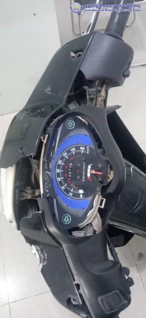 សម្ភាៈខូចខាត៖ ម៉ូតូម៉ាកហុងដាសេ១២៥ ពណ៌ ខ្មៅ សេរីឆ្នាំ២០១៧ ពាក់ផ្លាកលេខភ្នំពេញ ១GE-៥៧៩០។