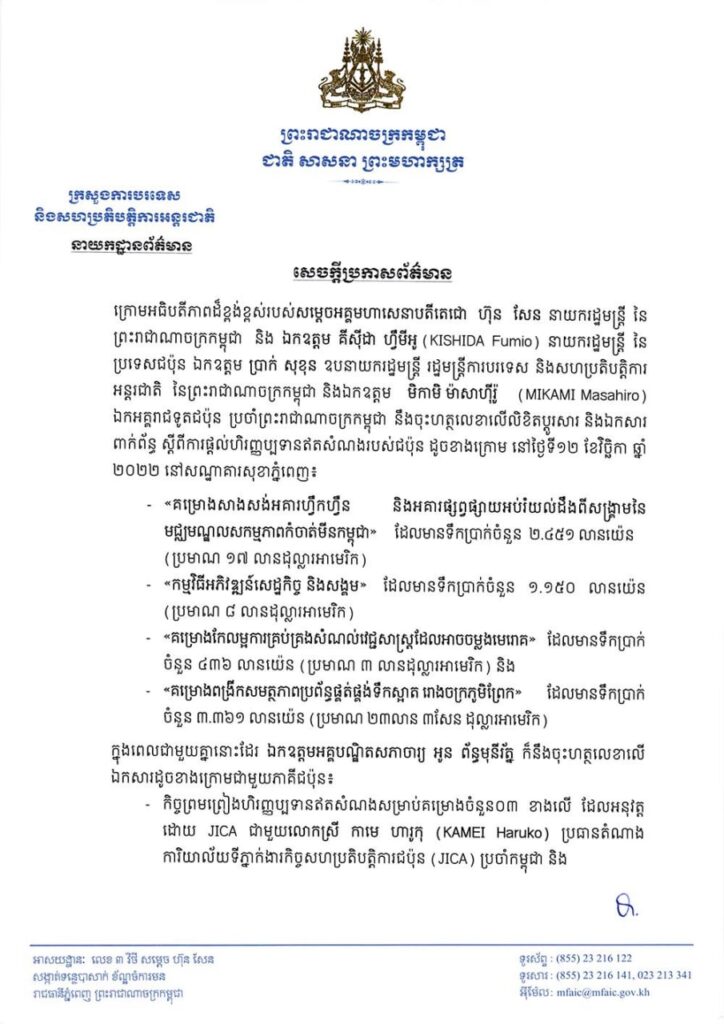 ការផ្តល់ហិរញ្ញប្បទានឥតសំណងនេះ បានចុះហត្ថលេខាលើលិខិតប្តូរសារ និងឯកសារ ក្រោមអធិបតីភាព សម្តេចតេជោ ហ៊ុន សែន នាយករដ្ឋមន្ត្រីនៃកម្ពុជា និងលោក គីស៊ីដា ហ្វូមីអូ នាយករដ្ឋមន្ត្រីជប៉ុន ក្រោយជំនួបទ្វេភាគី នៅរសៀលថ្ងៃសៅរ៍ ទី១២ ខែវិច្ឆិកា ឆ្នាំ២០២២នេះ។