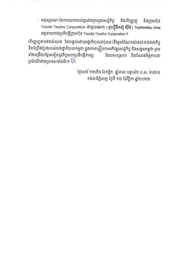- អនុស្សារណៈនៃការយោគយល់គ្នារវាងក្រសួងសេដ្ឋកិច្ច និងហិរញ្ញវត្ថុ និង ក្រុមហ៊ុន Toyota Tsusho Corporation ជាមួយលោក (តូហ្ស៉ីមីតស៊ូ អ៉ីម៉ៃ) Toshimitsu Imal អគ្គនាយករងប្រតិបត្តិក្រុមហ៊ុន Toyota Tsusho Corporation។