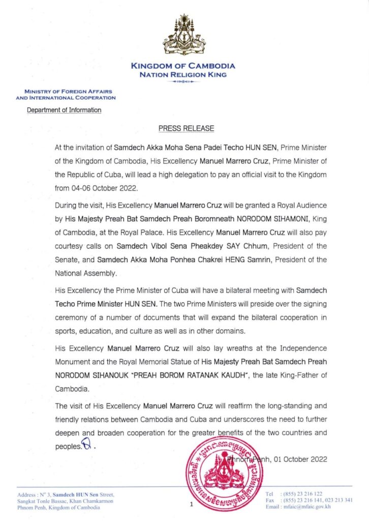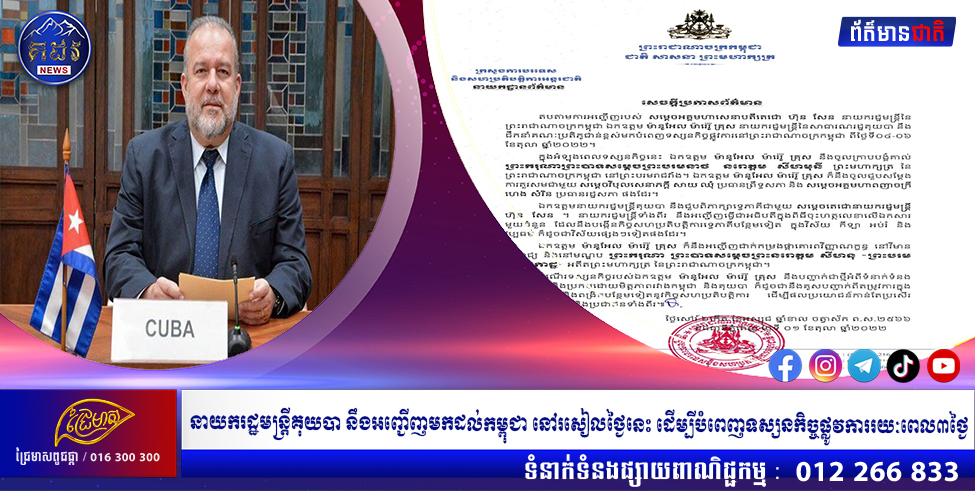 (ភ្នំពេញ)៖ លោក ម៉ានូអែល ម៉ារ៉េរ៉ូ គ្រុស នាយករដ្ឋមន្ត្រីនៃសាធារណរដ្ឋគុយបា នឹងដឹកនាំគណៈប្រតិភូជាន់ខ្ពស់មកដល់ប្រទេសកម្ពុជា នៅរសៀល ថ្ងៃទី០៤ ខែតុលា ឆ្នាំ២០២២នេះ ដើម្បីបំពេញទស្សនកិច្ចផ្លូវការរយៈពេល៣ថ្ងៃ ដើម្បីពង្រឹង និងពង្រីកទំនាក់ទំនង និងកិច្ចសហប្រតិបត្តិការទ្វេភាគី។