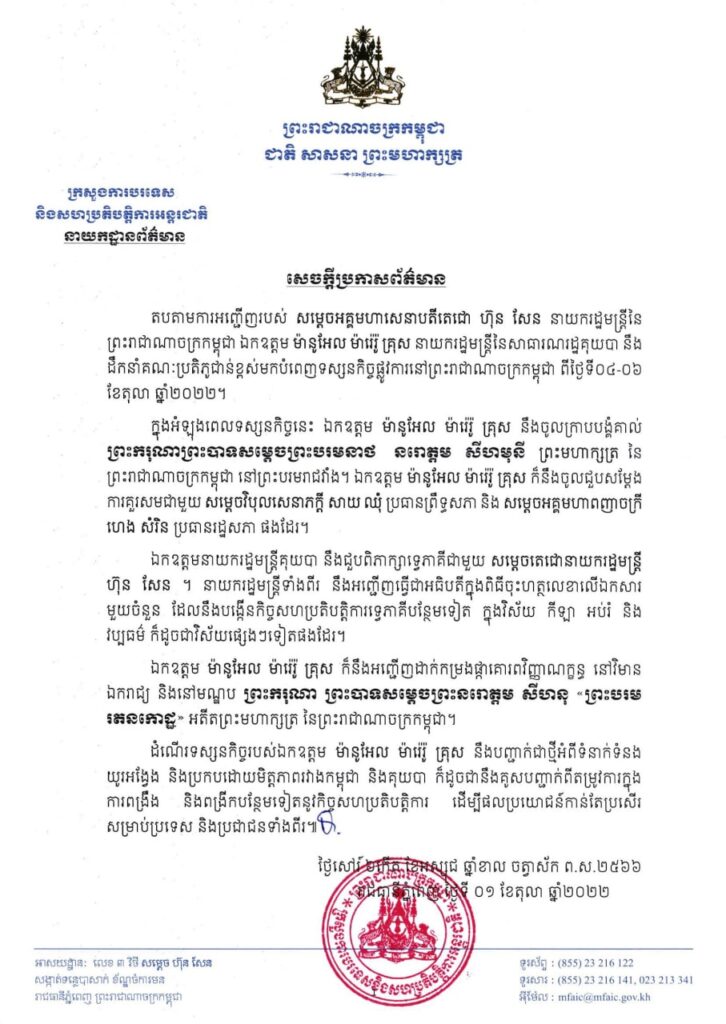 អំឡុងទស្សនកិច្ចផ្លូវការ លោកម៉ានូអែល ម៉ារ៉េរ៉ូ គ្រុស ក៏នឹងអញ្ជើញដាក់កម្រងផ្កាគោរពវិញ្ញាណក្ខន្ធ នៅវិមានឯករាជ្យ និងនៅមណ្ឌប ព្រះករុណា ព្រះបាទសម្ដេចព្រះនរោត្ដម សីហនុ «ព្រះបរមរតនកោដ្ឋ» អតីតព្រះមហាក្សត្រ នៃព្រះរាជាណាចក្រកម្ពុជា។