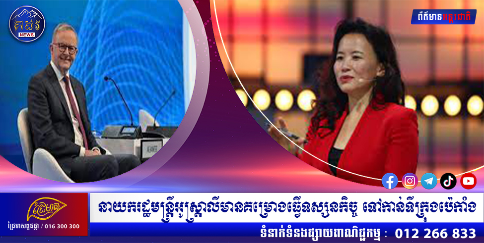 (ស៊ីដនី)៖ នាយករដ្ឋមន្ត្រីអូស្ត្រាលី លោក Anthony Albanese នៅថ្ងៃអាទិត្យនេះបាននិយាយថាលោកនឹងកំណត់កាលបរិច្ឆេទ សម្រាប់ការបំពេញទស្សនកិច្ច ទៅកាន់ប្រទេសចិន នៅពេលវេលាស័ក្តិសមណាមួយ ខណៈលោកសង្កត់ធ្ងន់ពីសារៈសំខាន់នៃទំនាកទំនងពាណិជ្ជកម្មទ្វេភាគី និងបង្ហាញក្ដីកង្វល់ពីអ្នកកាសែត អូស្ត្រាលីម្នាក់ដែលជាប់ឃុំក្នុងទីក្រុងប៉េកាំង។ នេះបើតាមការចេញផ្សាយដោយទីភ្នាក់ងារសារព័ត៌មាន Reuters នៅថ្ងៃអាទិត្យ ទី២៥ ខែមិថុនា ឆ្នាំ២០២៣។