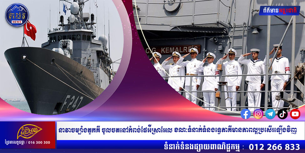 (ហ្ស៊េរុយសាឡិម)៖ នាវាចម្បាំងតួកគី បានចូលចតនៅឯកំពង់ផែប្រទេសអ៉ីស្រាអែល សម្រាប់ដំណើរទស្សនកិច្ចលើកដំបូង ក្នុងរយៈពេលជាងមួយទសវត្សរ៍មកនេះ ខណៈទំនាក់ទំនងរវាងសម្ព័ន្ធមិត្តទាំងពីររបស់សហរដ្ឋអាមេរិក មានភាពល្អប្រសើរឡើងវិញ បន្ទាប់ពីមានជម្លោះដ៏ខ្លាំងក្លាលើបញ្ហាប៉ាឡេស្ទីន។ នេះបើយោងតាម ការចុះផ្សាយដោយទីភ្នាក់ងារសារព័ត៌មាន Reuters នៅថ្ងៃចន្ទ ទី៥ ខែកញ្ញា ឆ្នាំ២០២២។