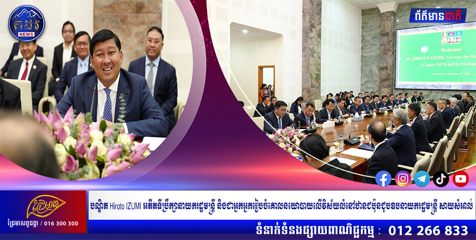 ភ្នំពេញ៖ ឧបនាយករដ្ឋមន្រ្តី សាយ សំអាល់ ថ្លែងអំណរគុណប្រទេសជប៉ុន ក្នុងជំនួបជាមួយគណៈប្រតិភូក្រុមហ៊ុនឯកជនជប៉ុន ដឹកនាំដោយលោកបណ្ឌិត Hiroto IZUMI អតីតទីប្រឹក្សានាយករដ្ឋមន្ត្រីជប៉ុន និងជាអ្នករៀបចំគោលនយោបាយលើវិស័យលំនៅឋានជប៉ុន កាលពីថ្ងៃទី២០ ខែវិច្ឆិកា ឆ្នាំ២០២៣។