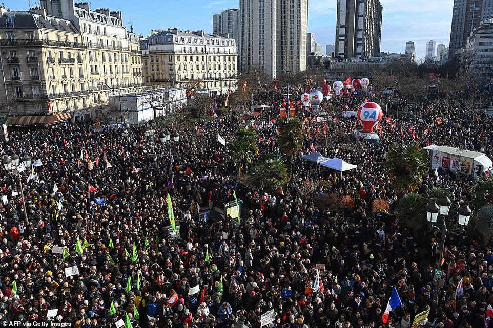 ប៉ារីស៖ ក្រសួងមហាផ្ទៃបារាំងបានបញ្ជាក់ថា ក្រុមអ្នកតវ៉ាប្រឆាំងនឹងផែនការរបស់ប្រធានាធិបតីបារាំង លោក អេម៉ានុយអែល ម៉ាក្រុង ដើម្បីធ្វើកំណែទម្រង់ប្រព័ន្ធសោធននិវត្តន៍ បានប្រមូលផ្តុំគ្នានៅថ្ងៃអង្គារសប្តាហ៍នេះ ដោយមានមនុស្សជាង ១.២៧លាននាក់ដើរដង្ហែក្បួនតវ៉ានៅតាមដងផ្លូវ។