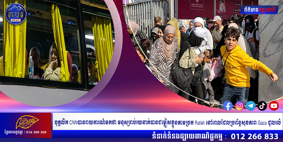 មនុស្សរាប់រយនាក់ជម្លៀសខ្លួនតាមច្រក Rafah៖ យ៉ាងហោចណាស់មានជនបរទេសចំនួន ៨២៦ នាក់បានជម្លៀសចេញពីតំបន់ Gaza តាមរយៈច្រក Rafah កាលពីថ្ងៃអាទិត្យ មន្ត្រីព្រំដែនអេហ្ស៊ីបបានប្រាប់អ្នកកាសែតដែលធ្វើការឱ្យ CNN ដែលជាចំនួនច្រើនបំផុតក្នុងការចាកចេញពី Gaza ក្នុងរយៈពេលតែមួយថ្ងៃចាប់តាំងពីសង្គ្រាមផ្ទុះឡើង។ មន្ត្រីរដ្ឋាភិបាលម្នាក់បាននិយាយថា យ៉ាងហោចណាស់ជនជាតិប៉ាឡេស្ទីនដែលរងរបួសចំនួនប្រាំបួននាក់ក៏បានឆ្លងចូលទៅក្នុងប្រទេសអេហ្ស៊ីបផងដែរ។ Rafah គឺជាច្រកឆ្លងកាត់តែមួយគត់ដែលបានបើកកំឡុងពេលការឡោមព័ទ្ធរបស់អ៊ីស្រាអែលនៅលើក្របខណ្ឌ ដែលធ្វើឱ្យវាជាគន្លឹះនៃកិច្ចខិតខំប្រឹងប្រែងក្នុងតំបន់ដើម្បីទទួលបានជំនួយ និងមនុស្សចេញ។