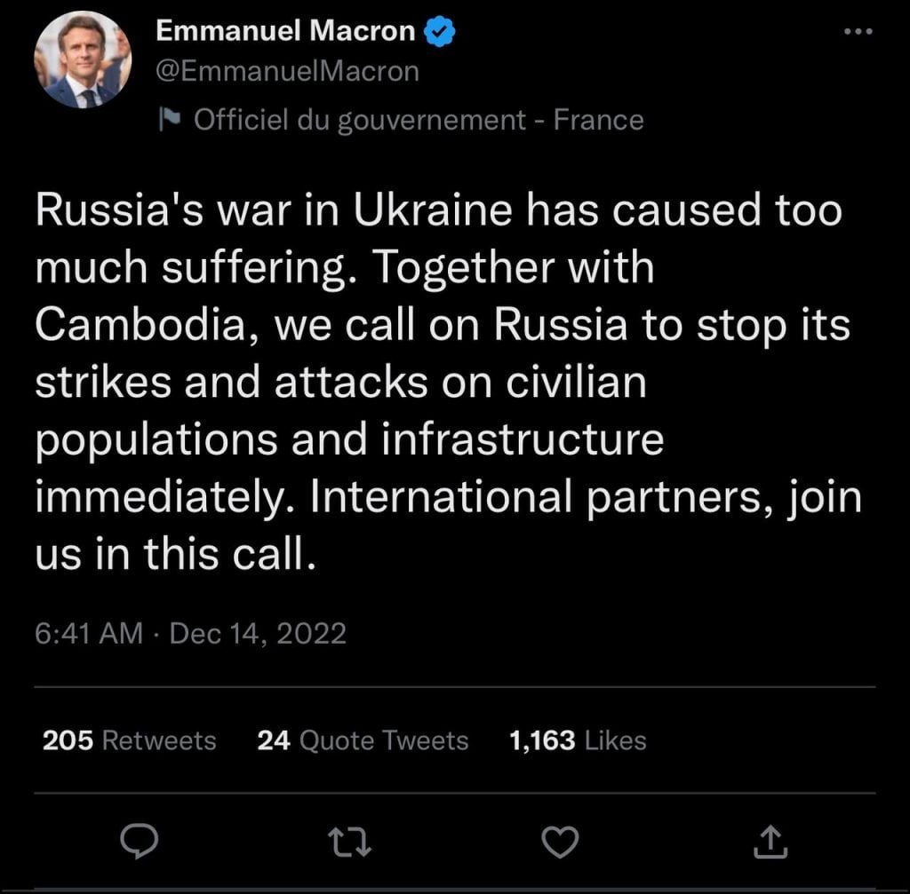 លោក ម៉ាក្រុង បានបង្ហោះលើបណ្ដាញសង្គម Twitter របស់ លោក នៅថ្ងៃទី១៤ ខែធ្នូ ឆ្នាំ២០២២នេះថា៖ “សង្គ្រាម រុស្ស៊ី នៅ អ៊ុយក្រែន បាន បង្ក ឱ្យ មាន ទុក្ខ វេទនា ខ្លាំង ពេក។ រួមគ្នាជាមួយកម្ពុជា យើងអំពាវនាវឱ្យរុស្ស៊ីបញ្ឈប់ការវាយប្រហារ និងការវាយប្រហារលើប្រជាជនស៊ីវិល និងហេដ្ឋារចនាសម្ព័ន្ធជាបន្ទាន់។ ដៃគូអន្តរជាតិ សូមចូលរួមជាមួយយើងនៅក្នុងការអំពាវនាវនេះ”។