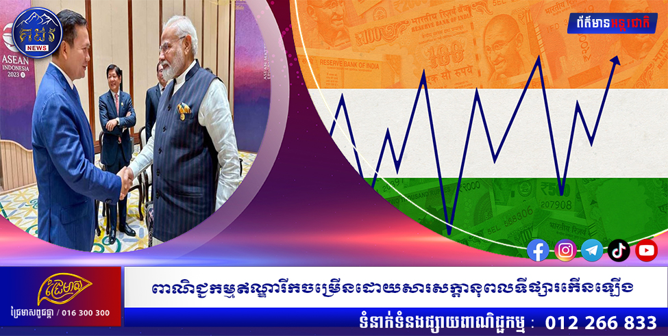 ការនាំចេញរបស់កម្ពុជាទៅកាន់ប្រទេសឥណ្ឌាបានកើនឡើងដល់ជិត 191 លានដុល្លារក្នុងរយៈពេល 9 ខែដំបូងនៃឆ្នាំ 2023 ដែលជាការកើនឡើងគួរឱ្យកត់សម្គាល់ 50% បើធៀបនឹងរយៈពេលដូចគ្នាកាលពីឆ្នាំមុន។ ពាណិជ្ជកម្មទ្វេភាគីឈានដល់ជិត 350 លានដុល្លារក្នុងអំឡុងពេលនេះ ដូចដែលបានរាយការណ៍ដោយអគ្គនាយកដ្ឋានគយ និងរដ្ឋាករ (GDCE)។