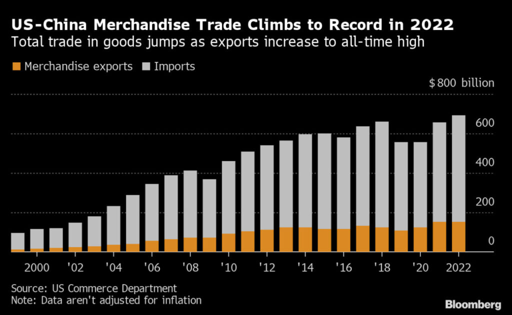 តួលេខទំហំពាណិជ្ជកម្ម អាមេរិក-ចិន កើនឡើងដល់កម្រិតខ្ពស់បំផុត សរុបជាង ៦៩០.៦ ពាន់លានដុល្លារ សម្រាប់ការនាំចេញនាំចូលក្នុងឆ្នាំ ២០២២ បើទោះបីជាបច្ចុប្បន្នប្រទេសទាំងពីរកំពុងមា ភាពតានតឹងជាមួយគ្នាក៏ដោយ ។