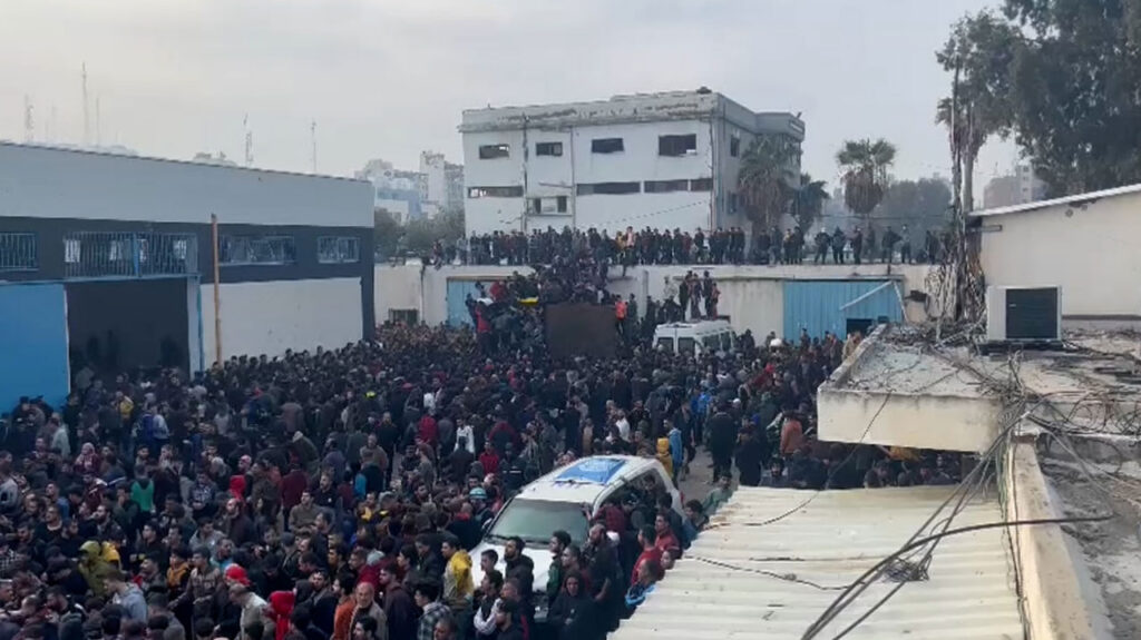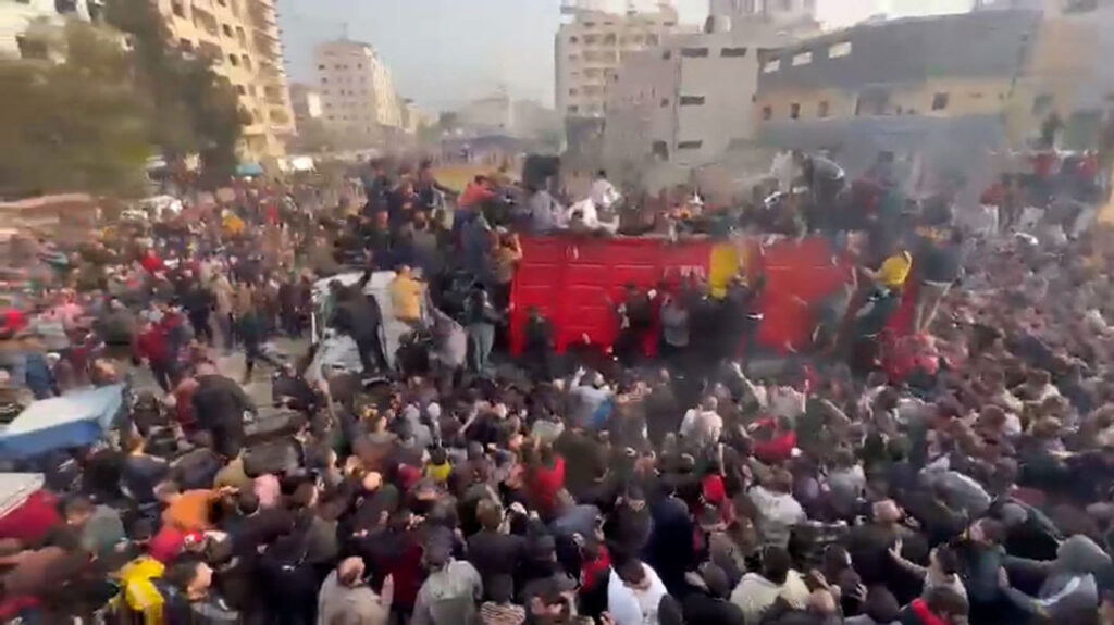 ជនស៊ីវិលដែលអស់សង្ឃឹមរាប់ពាន់នាក់នៅហ្គាហ្សាស្ទ្រីបបានឡោមព័ទ្ធក្បួនរថយន្តជំនួយសង្គ្រោះនៅមជ្ឈមណ្ឌលអង្គការសហប្រជាជាតិក្នុងសង្កាត់ Al-Zeitoun ភាគខាងជើងហ្គាហ្សា ដូចដែលបានឃើញនៅក្នុងវីដេអូ CNN កាលពីថ្ងៃព្រហស្បតិ៍។ ក្បួនរថយន្តជំនួយមានឡានដឹកទំនិញពីរគ្រឿងដែលកំពុងចែកចាយជំនួយនៅខាងក្រៅមជ្ឈមណ្ឌលនៃទីភ្នាក់ងារអង្គការសហប្រជាជាតិសម្រាប់ជនភៀសខ្លួនប៉ាឡេស្ទីន (UNRWA) ដែលជាកន្លែងដែលមនុស្សត្រូវបានគេមើលឃើញថាបានឡើងពីលើពួកគេដោយអស់សង្ឃឹមដើម្បីទទួលបានជំនួយសង្គ្រោះ។ កាលពីដើមសប្តាហ៍នេះ អង្គការស្បៀងអាហារ និងកសិកម្មនៃអង្គការសហប្រជាជាតិ (FAO) បានសម្តែងនូវ “ការព្រួយបារម្ភយ៉ាងខ្លាំង” លើស្ថានភាពសន្តិសុខស្បៀងដែលកាន់តែអាក្រក់ឡើងយ៉ាងឆាប់រហ័សនៅក្នុងតំបន់ហ្គាហ្សាស្ទ្រីប ដោយនិយាយថាអ្នកស្រុកប្រមាណ 2.2 លាននាក់កំពុងប្រឈមនឹងការអត់ឃ្លានធ្ងន់ធ្ងរ។