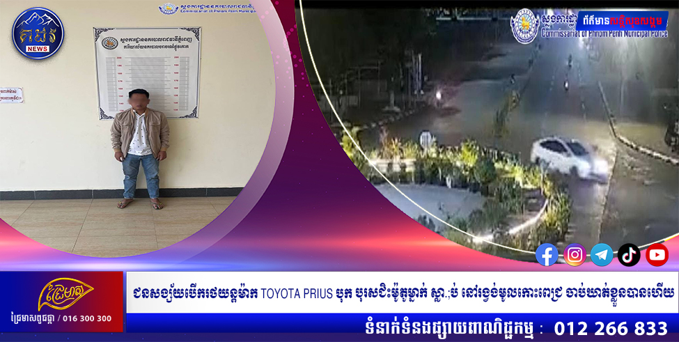 ភ្នំពេញ៖ អនុវត្តតាមបញ្ជាផ្ទាល់របស់ឯកឧត្តម ឧត្តមសេនីយ៍ឯក ជួន ណារិន្ទ អគ្គស្នងការរង និងជាស្នងការនគរបាលរាជធានីភ្នំពេញ ជនសង្ស័យម្នាក់ដែលបានបើករថយន្តម៉ាក TOYOTA PRIUS បង្ក បុ.;ក បុរសម្នាក់ជិះម៉ូតូបណ្តាលឱ្យ ស្លា.; ប់ នៅចំណុចរង្វង់មូលកោះពេជ្រ វិថីសួនច្បារ ប្រសព្វវិថីកោះពេជ្រ សង្កាត់ទន្លេបាសាក់ ខណ្ឌចំការមន រាជធានីភ្នំពេញ ត្រូវបានកម្លាំងជំនាញការិយាល័យនគរបាលចរាចរណ៍ផ្លូវគោក នៃស្នងការដ្ឋាននគរបាលរាជធានីភ្នំពេញ សហការជាមួយកម្លាំងប៉ុស្តិ៍នគរបាលរដ្ឋបាលវាលស្បូវ នៃអធិការដ្ឋាននគរបាលខណ្ឌច្បារអំពៅស្រាវជ្រាវចាប់ឃាត់ខ្លួនបានហើយនៅរសៀលថ្ងៃទី០៩ ខែធ្នូ ឆ្នាំ២០២៣ នៅសង្កាត់វាលស្បូវ ខណ្ឌច្បារអំពៅ។