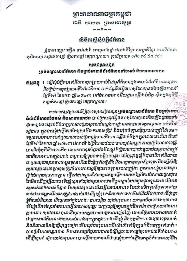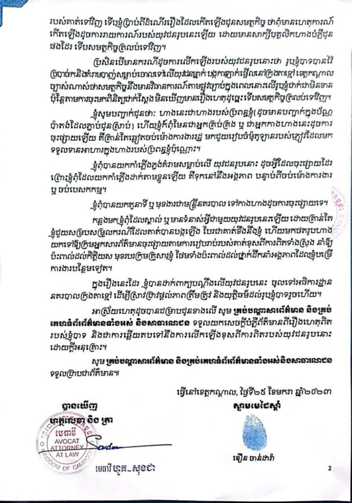 បានបន្ដិច យុវជនរូបនោះ យកទូរស័ព្ទទៅថតមុខហាងទើប លោកដើរទៅសួរនាំថាហេតុអ្វីថតហាងដូច្នេះ បញ្ហាបង្កឱ្យឡានភ្ញៀវមិនទាន់ដោះស្រាយផងនោះភ្លាមនោះ យុវជននេះបានដើរចូលមកក្នុងហាងបង្កភាពរញ៉េរញ៉ែ ដោយផ្អែកអះអាងថាគាត់ជាអ្នកសារព័ត៌មាន ដោយមានបំណងអុកឡុកក្នុងហាង ទើបលោក និងបុគ្គលិកហាងផ្សេងទៀតឃាត់ និងនិយាយមិនឱ្យធ្វើដូច្នេះទៀត ទើបយុវជនរូបនេះដើរសំដៅទៅម៉ូតូរួចក៏ជិះចេញទៅបាត់។