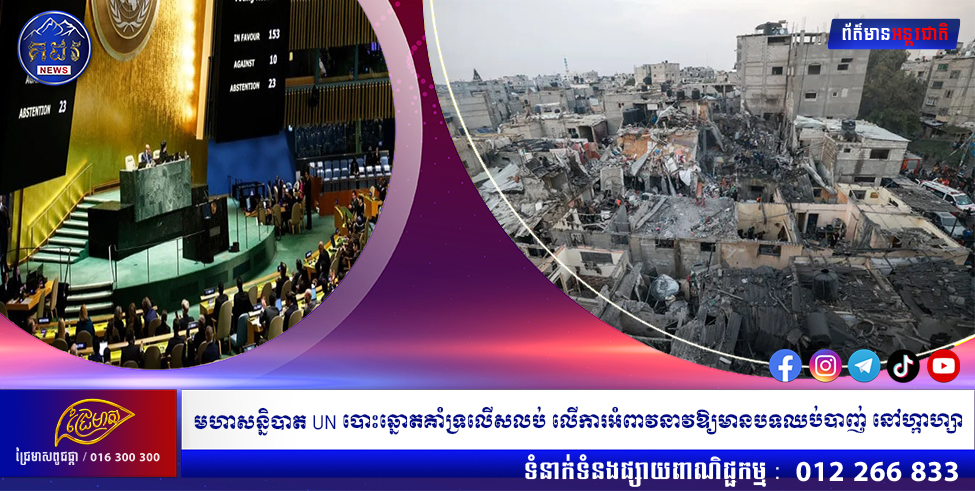 -មហាសន្និបាតអង្គការសហប្រជាជាតិ បានបោះឆ្នោតគាំទ្រក្នុងសំឡេងភាគច្រើន លើសលប់ លើដំណោះស្រាយអំពាវនាវឱ្យមានបទឈប់បាញ់ក្នុងសង្គ្រាមរវាងអីស្រាអែល និងហាម៉ាសនៅហ្គាហ្សា។ នៅក្នុងចំណោមសមាជិកសរុប ១៩៣ប្រទេសនៃមហា សន្និបាតអង្គការសហប្រជាជាតិ មានប្រទេសចំនួន១៥៣បានបោះឆ្នោតគាំទ្រឱ្យមានបទ ឈប់បាញ់ ហើយដែលសំឡេងនេះ គឺលើសសំឡេងគាំទ្រក្នុងការបោះឆ្នោតពាក់ព័ន្ធនឹង សង្គ្រាមអ៊ុយក្រែន ដែលជាទូទៅប្រទេសចំនួន១៤០ បានបោះឆ្នោតគាំទ្រលើ ដំណោះ ស្រាយថ្កោលទោសសង្គ្រាមឈ្លានពានរបស់រុស្ស៊ីនៅអ៊ុយក្រែន។ ចំណែក ប្រទេសចំនួន ១០ ក្នុងនោះមានទាំងសហរដ្ឋអាមេរិក និងអីស្រាអែល បានបោះឆ្នោតប្រឆាំងនឹងដំណោះស្រាយគាំទ្របទឈប់បាញ់នៅហ្កាហ្សា ខណៈ ២៣ប្រទេសផ្សេងទៀតបោះឆ្នោតអនុប្បវាទ។