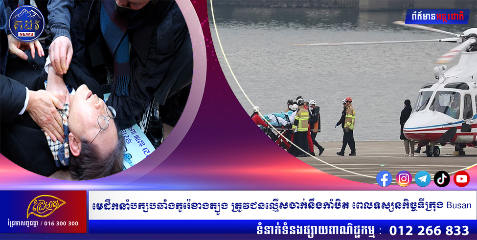 មេដឹកនាំគណបក្សប្រឆាំងក្នុងប្រទេសកូរ៉េ ខាងត្បូងលោក Lee Jae-Myung ត្រូវបាន ដឹកតាមយន្តហោះទៅកាន់មន្ទីរពេទ្យ កាល ពីថ្ងៃអង្គារ បន្ទាប់ពីលោកត្រូវបានគេចាក់នឹងកាំបិតចំក ក្នុងពេលលោកកំពុងទស្សន កិច្ចក្នុងទីក្រុងកំពង់ផែ Busan នៅភាគអាគ្នេយ៍ប្រទេសកូរ៉េខាងត្បូង។ មេដឹកនាំគណ បក្សប្រជាធិបតេយ្យរូបនេះកំពុងជួបជាមួយក្រុមអ្នកសារព័ត៌មាននៅការដ្ឋានសាងសង់ព្រលានយន្តហោះថ្មីមួយ ស្រាប់តែមានបុរសម្នាក់ បានដើរសំដៅមករករូបលោកដើម្បីសុំហត្ថលេខាពីលោក។