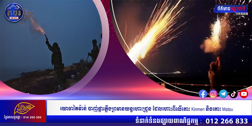 (តៃប៉ិ)៖ ក្រសួងការពារជាតិតៃវ៉ាន់ នៅថ្ងៃសៅរ៍នេះ បានឱ្យដឹងថាយោធារបស់ខ្លួនបានបាញ់ផ្កាភ្លើងព្រមានយន្ដហោះដ្រូនចំនួន ៧គ្រឿង ឱ្យចេញឆ្ងាយពី កោះគីនមិន (Kinmen) និងបានព្រមានយន្ដហោះមិនស្គាល់ម៉ាកមួយគ្រឿងដែលហោះពីលើកោះម៉ាត់ស៊ុ (Matsu)។ នេះបើតាមការចេញផ្សាយ ដោយទីភ្នាក់ងារសារព័ត៌មាន Reuters នៅថ្ងៃសៅរ៍ ទី៦ ខែសីហា ឆ្នាំ២០២២។