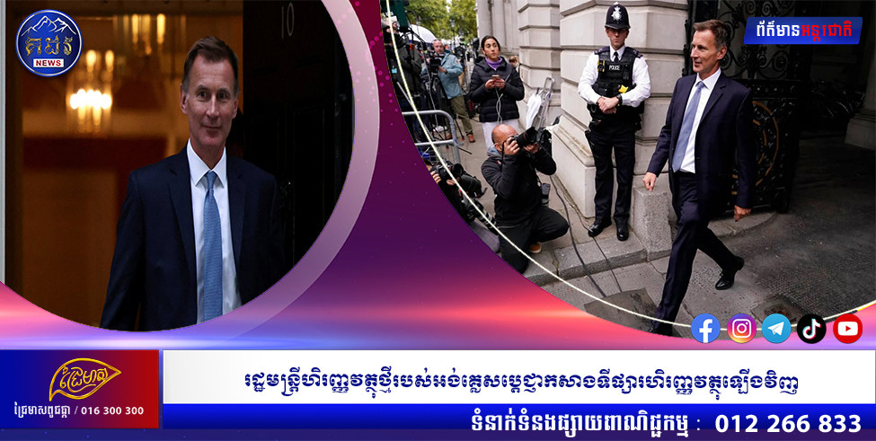 (ឡុងដ៍)៖ រដ្ឋមន្ត្រីក្រសួងហិរញ្ញវត្ថុថ្មី លោក Jeremy Hunt បានសន្យាថា នឹងស្តារភាពជឿជាក់ខាងសេដ្ឋកិច្ចរបស់ចក្រភពអង់គ្លេសឡើងវិញ ដោយគណនេយ្យពេញលេញសម្រាប់ផែនការចំណាយ និងពន្ធរបស់រដ្ឋាភិបាល ខណៈពេលដែលលោកជឿជាក់ថា លោកស្រី Liz Truss នឹងនៅបន្តគ្រប់គ្រងប្រទេស។ នេះបើយោងតាមការចេញផ្សាយដោយ ទីភ្នាក់ងារសារព័ត៌មាន AFP នៅថ្ងៃអាទិត្យ ទី១៦ ខែតុលា ឆ្នាំ២០២២។