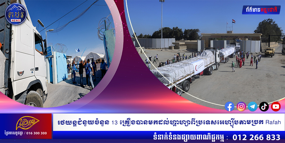 រថយន្តជំនួយចំនួន 13 គ្រឿងបានឆ្លងកាត់ការត្រួតពិនិត្យ និងធ្វើដំណើរចូលទៅក្នុង Gaza Strip ពីប្រទេសអេហ្ស៊ីប