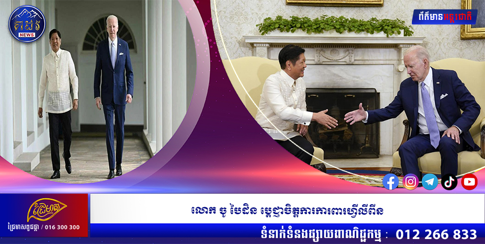 (វ៉ាស៊ីនតោន)៖ ប្រធានាធិបតីអាមេរិក លោក ចូ បៃដិន នៅថ្ងៃចន្ទសប្ដាហ៍នេះ បានបញ្ជាក់ឡើងវិញប្រាប់ប្រធានាធិបតីហ្វីលីពីន លោក ហ្វឺឌីណាន់ ម៉ាកូស ជេអ (Ferdinand Marcos Jr) ពីការប្ដេជ្ញាចិត្តឥតងាករេរបស់សហរដ្ឋអាមេរិក ក្នុងការការពារហ្វីលីពីន នៅចំពោះមុខភាពតានតឹងជាមួយចិន នៅឯតំបន់សមុទ្រចិនខាងត្បូង។