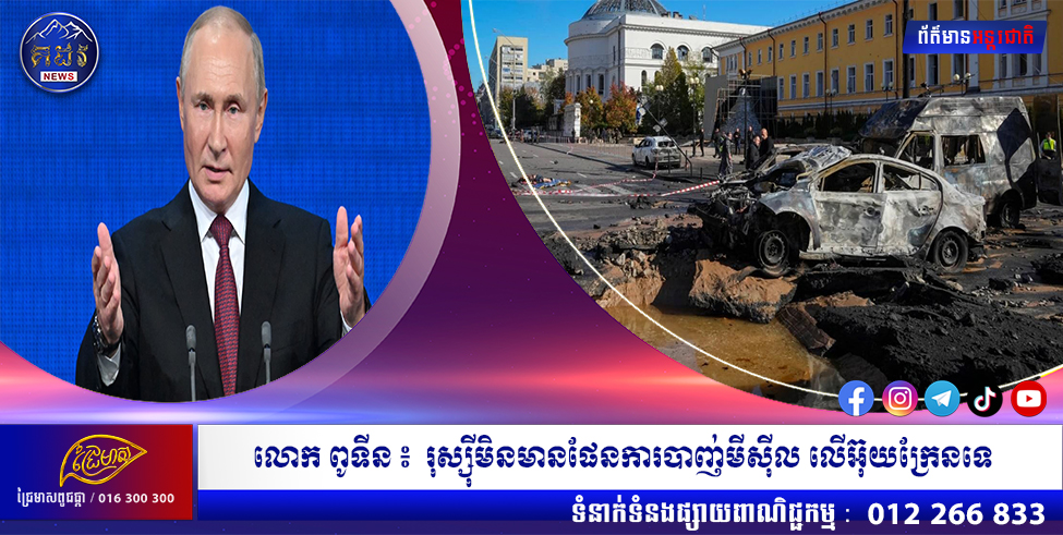 (កៀវ)៖ ប្រធានាធិបតីរុស្ស៊ី លោក វ្ល៉ាឌីមៀ ពូទីន បាននិយាយថា «ក្នុងពេលបច្ចុប្បន្ន» លោកមិនមានផែនការវាយប្រហារតាមផ្លូវអាកាសទ្រង់ទ្រាយធំ ដូចជាការបាញ់ ស្រោចមីស៊ីលរយៈចម្ងាយឆ្ងាយជាង១០០គ្រាប់ លើទីក្រុងកៀវ និងទីក្រុងជាច្រើននៅទូទាំងប្រទេសអ៊ុយក្រែន កាលពីថ្ងៃចន្ទដើមសប្ដាហ៍កន្លងទៅនោះទេ។ នេះបើតាម ការដកស្រង់ចេញផ្សាយពីទីភ្នាក់ងារសារព័ត៌មាន AFP នៅថ្ងៃសៅរ៍ ទី១៥ ខែតុលា ឆ្នាំ២០២២។