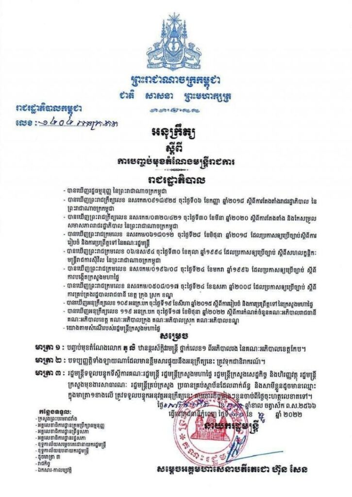 លោក ភូ លិ ពីអភិបាល រងខេត្តកែបដកចេញពីតំណែង ក្រោយប្រើហិង្សា និងបៀតបៀន លើស្ដ្រី២ នាក់