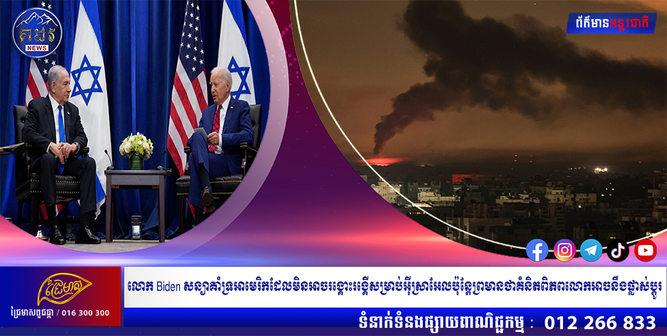 ប្រធានាធិបតីអាមេរិកលោក Joe Biden កាលពីយប់ថ្ងៃច័ន្ទបានសរសើរការគាំទ្រដែលមិនអាចរង្គោះរង្គើរបស់គាត់ចំពោះ “សុវត្ថិភាពរបស់ប្រជាជនជ្វីហ្វ និងសន្តិសុខរបស់អ៊ីស្រាអែល និងសិទ្ធិក្នុងការមាន” បន្ទាប់ពីការវាយប្រហារភេរវកម្មរបស់ពួកហាម៉ាសកាលពីថ្ងៃទី 7 ខែតុលា។