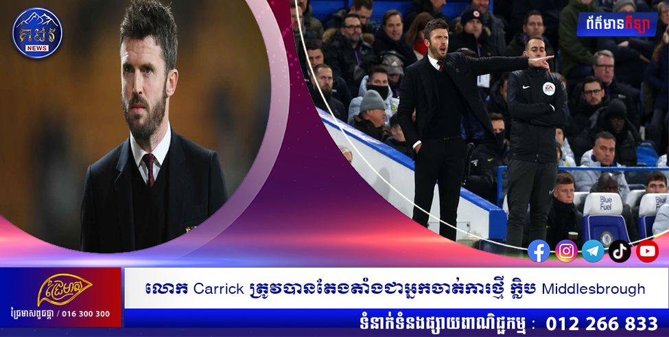 (មីដលប្រឺ)៖ ក្លិបបាល់ទាត់ Middlesbrough បានតែងតាំងអតីតអ្នកចាត់ការបណ្តោះអាសន្ន ក្លិប Manchester United លោក Michael Carrick ជាអ្នកចាត់ការថ្មីរបស់ពួកគេ។ នេះបើតាមការបញ្ជាក់ពីក្លិបលេងនៅលីគទី២ អង់គ្លេស Championship នៅថ្ងៃចន្ទ ខណៈអតីតខ្សែបម្រើរូបនេះ បានទទួលតួនាទីលើកដំបូង ក្នុងនាមជាអ្នកចាត់ការអចិន្ត្រៃយ៍។ នេះបើយោងតាមសារព័ត៌មាន CNA ចេញផ្សាយនាថ្ងៃទី២៥ ខែតុលា ឆ្នាំ២០២២។