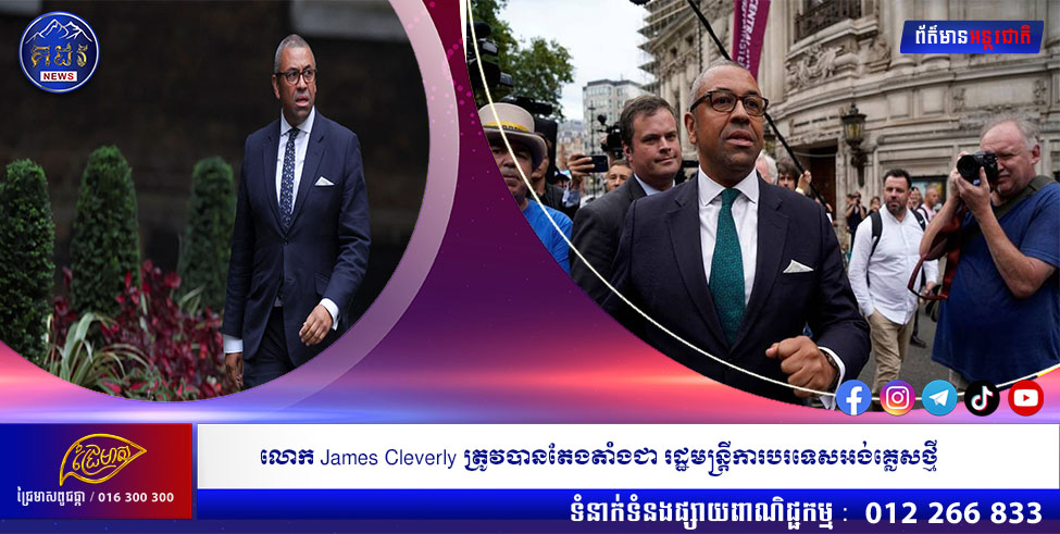 (ឡុងដ៍)៖ នាយករដ្ឋមន្រ្តីថ្មីរបស់ចក្រភពអង់គ្លេស គឺលោកស្រី លីស ត្រាស់ (Liz Truss) បានតែងតាំងលោក ជែម ក្លេវើលី (James Cleverly) ជារដ្ឋមន្រ្តីការបរទេស នៅក្នុងការប្រកាសសមាសភាពគណៈរដ្ឋមន្រ្តីថ្មី របស់លោកស្រី។ នេះបើតាមការចេញផ្សាយដោយ ទីភ្នាក់ងារសារព័ត៌មាន Reuters នៅថ្ងៃពុធ ទី៧ ខែកញ្ញា ឆ្នាំ២០២២។