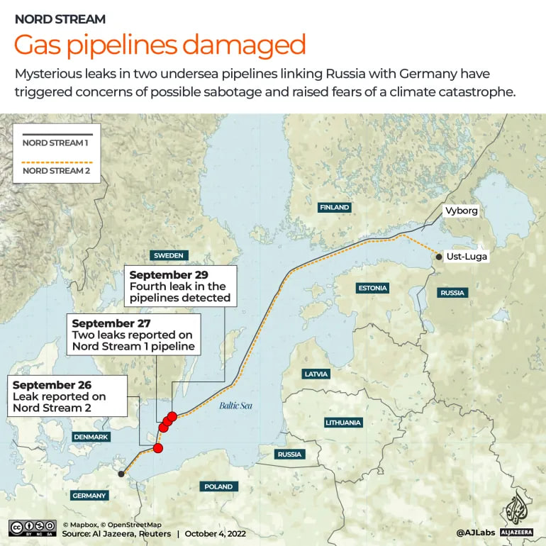 ការផ្ទុះដែលមិនអាចពន្យល់បានបានធ្វើឱ្យខូចទាំងបំពង់ Nord Stream 1 និងបំពង់ Nord Stream 2 ដែលទើបសាងសង់ថ្មី ដោយដឹកឧស្ម័នពីប្រទេសរុស្ស៊ីទៅកាន់ប្រទេសអាល្លឺម៉ង់នៅក្រោមសមុទ្របាល់ទិកកាលពីខែកញ្ញាឆ្នាំមុន។