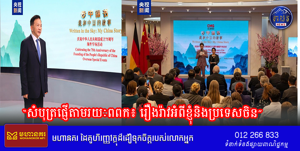ថ្ងៃទី ១៤ ខែកញ្ញា តាមម៉ោងក្នុងតំបន់ សកម្មភាពពិសេសនៅប្រទេសអាល្លឺម៉ង់ ដើម្បីអបអរសាទរខួបទី៧៥នៃការបង្កើតសាធារណរដ្ឋប្រជាមានិតចិន “សំបុត្រផ្ញើតាមរយៈពពក៖ រឿងរ៉ាវអំពីខ្ញុំនិងប្រទេសចិន”បានរៀបចំធ្វើដោយជោគជ័យនៅក្រុងបែរឡាំងប្រទេសអាល្លឺម៉ង់ ។ សកម្មភាពលើកនេះផ្តួចផ្តើមរៀបចំដោយអគ្គស្ថានីយវិទ្យុនិងទូរទស្សន៍មជ្ឈិមចិន ស្ថានទូតចិនប្រចាំនៅអាល្លឺម៉ង់ និងមជ្ឈមណ្ឌលផ្លាស់ប្តូរនិងកិច្ចសហប្រតិបតិ្តការខាងភាសាចិននិងបរទេសរបស់ក្រសួងអប់រំចិន ។