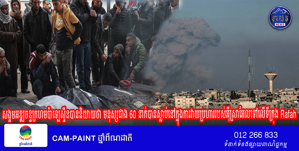 សមាគមអឌ្ឍចន្ទក្រហមប៉ាឡេស្ទីនបាននិយាយនៅព្រឹកថ្ងៃចន្ទនេះ ថាមនុស្សជាង60នាក់ត្រូវបានសម្លាប់នៅក្នុងការវាយប្រហារតាមអាកាសរបស់អ៊ីស្រាអែលទៅលើទីក្រុង Gazan ភាគខាងត្បូងនៃទីក្រុង Rafah ។ PRCS បាននិយាយថា ទីក្រុងដែលជាងពាក់កណ្តាលនៃចំនួនប្រជាជននៅតំបន់ហ្គាហ្សាកំពុងស្វែងរកការជ្រកកោននោះ បានទទួលបទពិសោធន៍ “ការកំណត់គោលដៅខ្លាំង” ដោយយន្តហោះចម្បាំង និងការវាយប្រហារតាមអាកាស។ ឧទ្ធម្ភាគចក្រក៏បានបាញ់កាំភ្លើងយន្តនៅតាមតំបន់ព្រំដែនរបស់ខ្លួន នេះបើយោងតាម PRCS ។ Rafah ស្ថិតនៅជិតព្រំដែន Gaza ជាមួយអេហ្ស៊ីប។កងកម្លាំងការពារអ៊ីស្រាអែលបានបញ្ជាក់កាលពីថ្ងៃចន្ទថាពួកគេបានធ្វើ “ការវាយប្រហារជាបន្តបន្ទាប់” លើគោលដៅនៅក្នុងតំបន់ Shaboura ដែលជាស្រុក Rafah ដោយនិយាយនៅក្នុងសេចក្តីថ្លែងការណ៍មួយថា “ការវាយប្រហារបានបញ្ចប់” ។