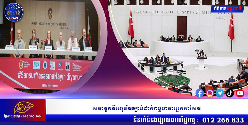 (អង់ការ៉ា)៖ សភារបស់ប្រទេសតួកគី កាលពីថ្ងៃព្រហស្បតិ៍កន្លងទៅ បានអនុម័តច្បាប់មួយ ដែលស្នើឡើងដោយប្រធានាធិបតី លោក Tayyip Erdogan ដែលនឹងដាក់ពន្ធនាគារអ្នកកាសែត និងអ្នកប្រើប្រាស់ប្រព័ន្ធផ្សព្វផ្សាយសង្គម រហូតដល់បីឆ្នាំ ចំពោះការផ្សព្វផ្សាយព័ត៌មានមិនពិត បើទោះបីជាមានការព្រួយបារម្ភយ៉ាងខ្លាំង លើសេរីភាពបញ្ចេញមតិក៏ដោយ។ នេះបើយោងតាមការចេញផ្សាយដោយ ទីភ្នាក់ងារសារព័ត៌មាន AFP។