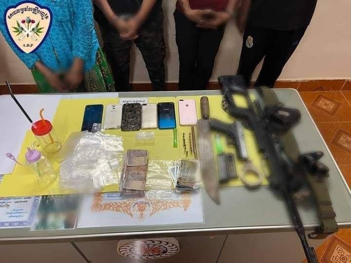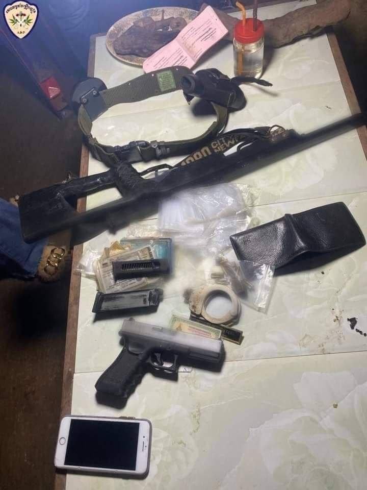 ១. មេតំហ្វេតាមីនអាយ ចំនួន ២កញ្ចប់ ទម្ងន់សុទ្ធ ២,៨៣ ក្រាម ២. កាំភ្លើងច្នៃវែងខ្លីចំនួន ២ដើម ៣. បង់ចំនួន ២ និងគ្រាប់ចំនួន ១៤គ្រាប់ ៤. ខ្នោះចំនួន ១គូ ៥. លុយខ្មែរចំនួន ៥៥០ ០០០ រៀល ៦. ថង់ច្រក និងសម្ភារៈសេពមួយចំនួន ៧. ម៉ូតូចំនួន ៤គ្រឿង ៨. ទូរសព្ទដៃចំនួន៦គ្រឿង។