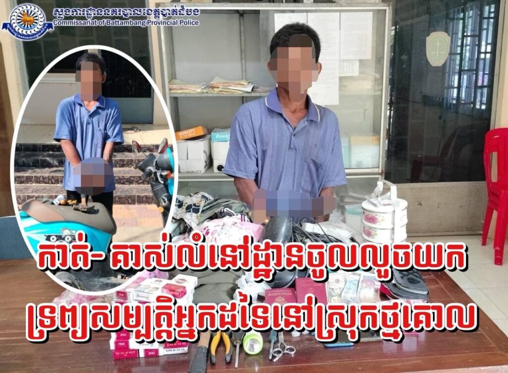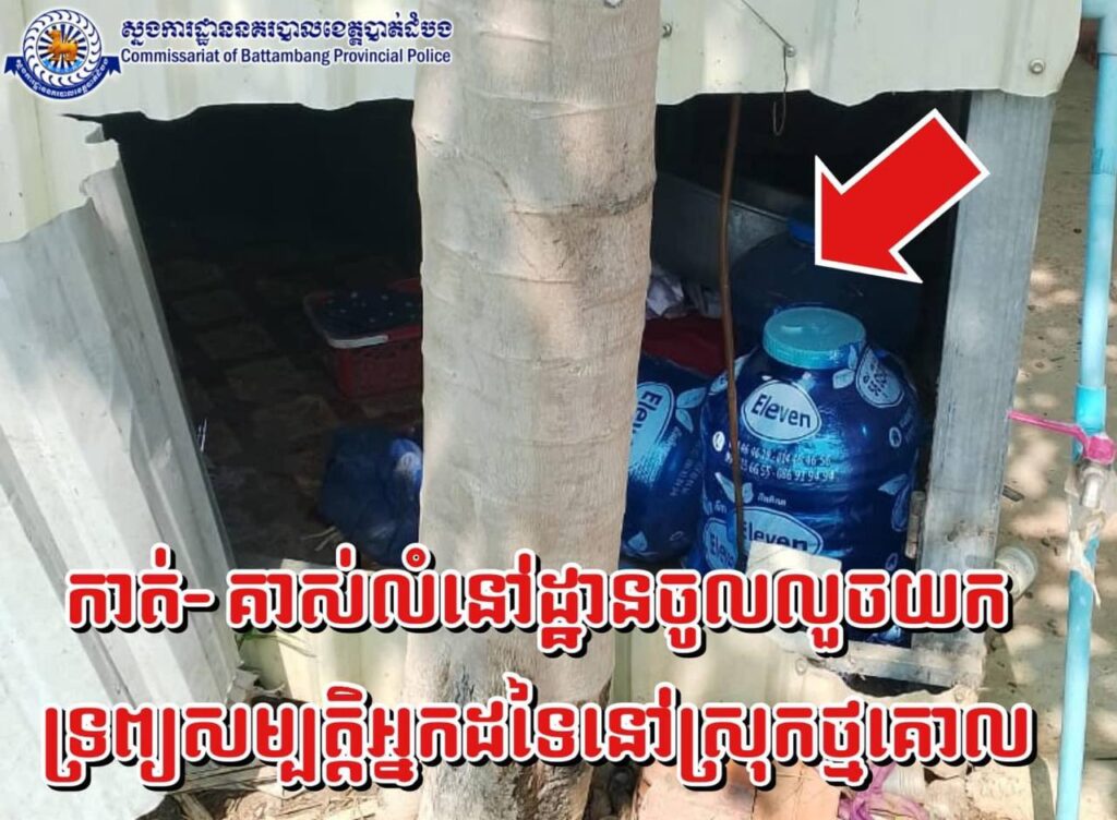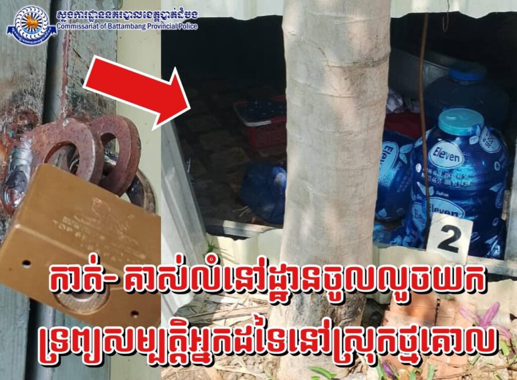 នៅថ្ងៃទី ០៣ ខែវិច្ឆិកាឆ្នាំ២០២៤ វេលាម៉ោង០៧និង០០នាទីនៅចំណុចក្រុមទី០២ ភូមិបឹងព្រីង ឃុំបឹងព្រីង ស្រុកថ្មគោល មានករណីលួច មានស្ថានទ-ម្ងន់ ទោ-ស(ក-ា-ត់ស័ង្កសីតូបលក់ចាប់ហួយ)បង្កឡើងដោយជនសង្ស័យមិនស្គាល់អត្តសញ្ញាណ បានធ្វើសក ម្មភាព ក-ាត់ស័ង្ក សី តូបលក់ចាប់ហួយរបស់ជន រងគ្រោះឈ្មោះស៊ាង រ៉ាស៊ី ភេទស្រី អាយុ៣១ឆ្នាំ មាន ទីលំនៅភូមិព្រះពន្លា ឃុំរូងជ្រៃ ស្រុកថ្មគោល យកអស់ទ្រព្យសម្បត្តិរួមមាន៖