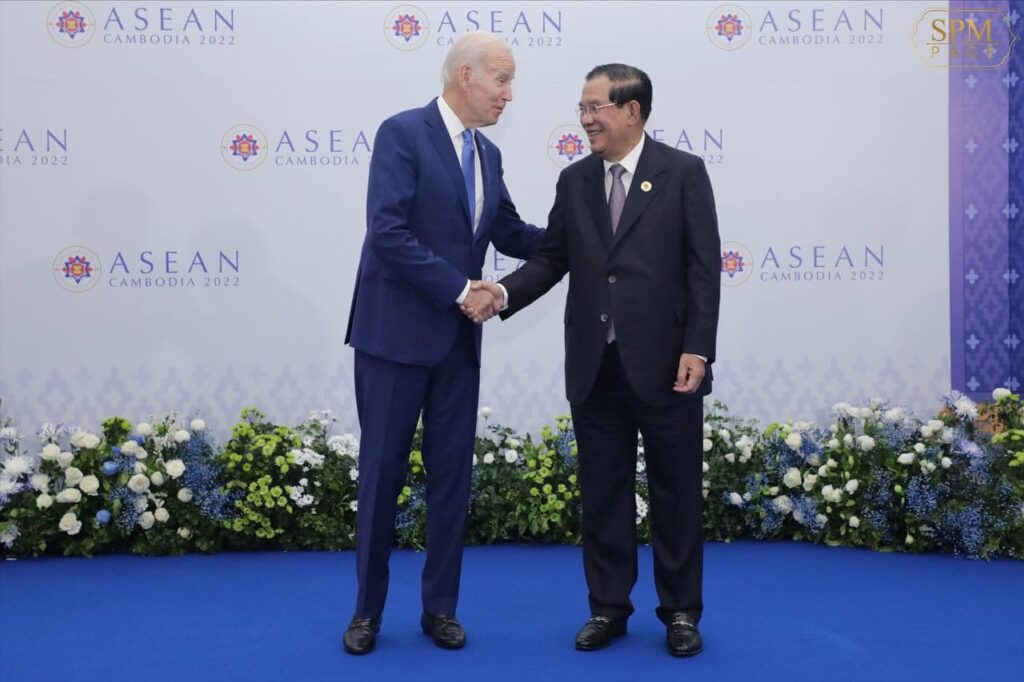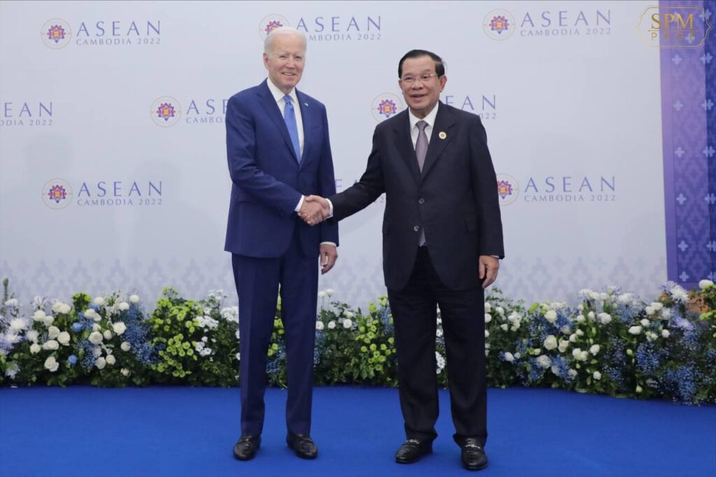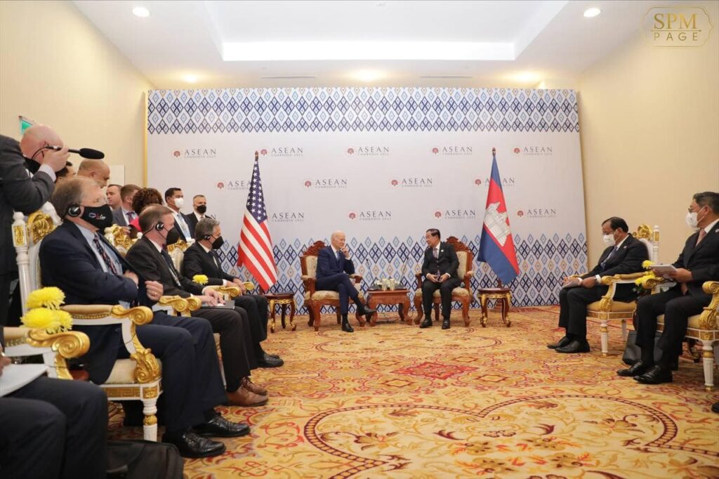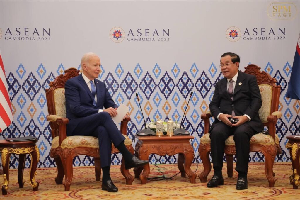 នៅល្ងាចថ្ងៃទី១២ ខែវិច្ឆិកា ឆ្នាំ២០២២នេះ ដែលជាថ្ងៃទី៣ នៃកិច្ចប្រជុំកំពូលអាស៊ានលើកទី ៤០,៤១ ដែលកម្ពុជាធ្វើជាម្ចាស់ផ្ទះនេះ សម្តេចអគ្គមហាសេនាបតីតេជោ ហ៊ុន សែន នាយករដ្ឋមន្រ្តី នៃព្រះរាជាណាចក្រកម្ពុជា បានទទួលធ្វើជំនួបពិភាក្សាកំពូលទ្វេភាគីជាមួយ ឯកឧត្តម ចូ បៃដិន (Joe Biden)ប្រធានាធិបតីសហរដ្ឋអាមេរិក ដែលជំនួននេះត្រូវបានធ្វើឡើងនៅសណ្ឋាគារសុខាភ្នំពេញ។