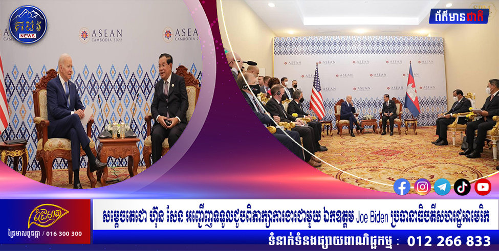 នៅល្ងាចថ្ងៃទី១២ ខែវិច្ឆិកា ឆ្នាំ២០២២នេះ ដែលជាថ្ងៃទី៣ នៃកិច្ចប្រជុំកំពូលអាស៊ានលើកទី ៤០,៤១ ដែលកម្ពុជាធ្វើជាម្ចាស់ផ្ទះនេះ សម្តេចអគ្គមហាសេនាបតីតេជោ ហ៊ុន សែន នាយករដ្ឋមន្រ្តី នៃព្រះរាជាណាចក្រកម្ពុជា បានទទួលធ្វើជំនួបពិភាក្សាកំពូលទ្វេភាគីជាមួយ ឯកឧត្តម ចូ បៃដិន (Joe Biden)ប្រធានាធិបតីសហរដ្ឋអាមេរិក ដែលជំនួននេះត្រូវបានធ្វើឡើងនៅសណ្ឋាគារសុខាភ្នំពេញ។