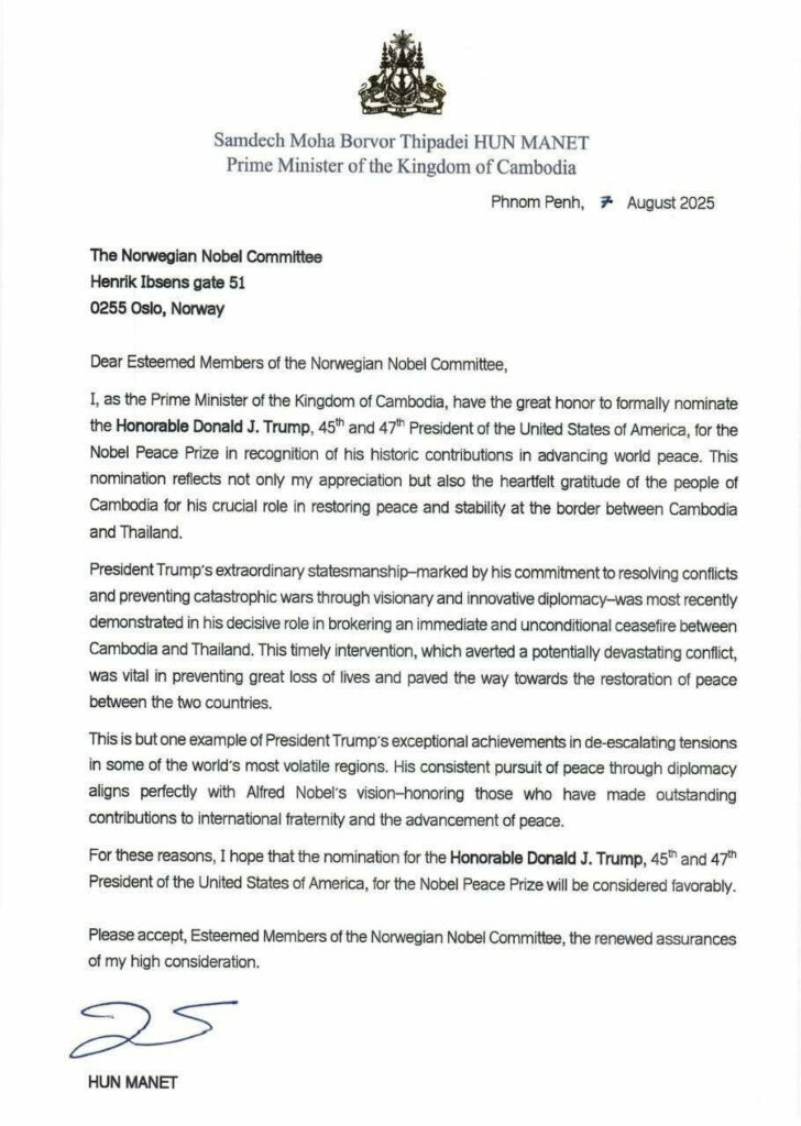 នៅតាមបណ្តាញសង្គមនៅយប់ថ្ងៃទី៧ ខែសីហា ឆ្នាំ២០២៥នេះ សម្តេចធិបតី ហ៊ុន ម៉ាណែត បានថ្លែងអមជាមួយលិខិតផ្លូវការដាក់ទៅកាន់គណ:កម្មការពានរង្វាន់ណូបែលសន្តិភាពយ៉ាងដូច្នេះថា «ស្របតាមសំណូមពររបស់ប្រជាពលរដ្ឋខ្មែរទាំងក្នុងនិងក្រៅប្រទេស និងដើម្បីជាការថ្លែងអំណរគុណចំពោះឯកឧត្តមប្រធានាធិបតី Donald Trump ដែលឯកឧត្តមបានយកចិត្តទុកដាក់ដោយផ្ទាល់ ក្នុងការផ្ដួចផ្ដើមនិងជំរុញឲ្យមានបទឈប់បាញ់គ្នារវាងកងទ័ពកម្ពុជានិងកងទ័ពថៃ និងបន្តតាមដានការអនុវត្តបទឈប់បាញ់រហូតដល់មានសន្តិភាពពេញលេញរវាងប្រទេសទាំងពីរ ខ្ញុំក្នុងនាមជានាយករដ្ឋមន្ត្រីនៃព្រះរាជាណាចក្រកម្ពុជា បានផ្ញើលិខិតជាផ្លូវការទៅគណៈកម្មការពានរង្វាន់ណូបែលសន្តិភាព ដើម្បីគាំទ្របេក្ខភាពឯកឧត្តមប្រធានាធិបតី Donald Trump សម្រាប់ពានរង្វាន់ណូបែលសន្តិភាព»៕
