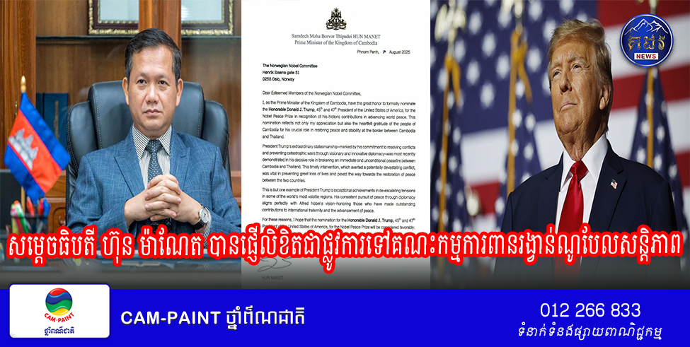 (ភ្នំពេញ)៖ សម្តេចមហាបវរធិបតី ហ៊ុន ម៉ាណែត នាយករដ្ឋមន្ត្រីនៃកម្ពុជា បានផ្ញើលិខិតជាផ្លូវការ ទៅគណៈកម្មការពានរង្វាន់ណូបែលសន្តិភាព ដើម្បីគាំទ្របេក្ខភាពលោកប្រធានាធិបតី Donald Trump សម្រាប់ពានរង្វាន់ណូបែលសន្តិភាព។