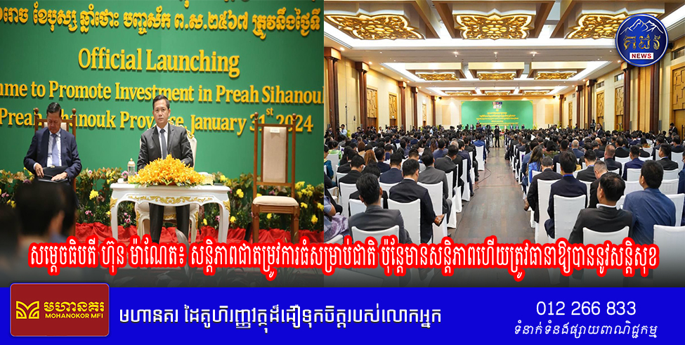 សម្ដេច មហាបវរធិបតី ហ៊ុន ម៉ាណែត បានថ្លែងយ៉ាងដូចនេះនាព្រឹក ថ្ងៃទី៣១ ខែមករា ឆ្នាំ២០២៤នេះ នាឱកាសអញ្ជើញជា អធិបតីប្រកាសដាក់ឱ្យអនុវត្តជាផ្លូវការ «កម្មវិធីពិសេសជំរុញ ការវិនិយោគក្នុងខេត្តព្រះសីហនុ ឆ្នាំ២០២៤»។